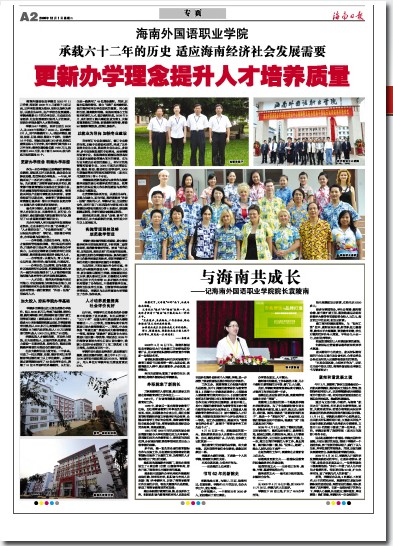 海南外國語職業(yè)學院自2003年11月升格,特別是2008年4月新班子上任以來,以科學發(fā)展觀為指導,堅持以服務(wù)為宗旨,以就業(yè)為導向,走產(chǎn)學結(jié)合發(fā)展道路。學院承載著62年的辦學歷史,主動適應(yīng)全省經(jīng)濟、社會發(fā)展需要對實用人才的需求,更新辦學理念提升人才培養(yǎng)質(zhì)量。