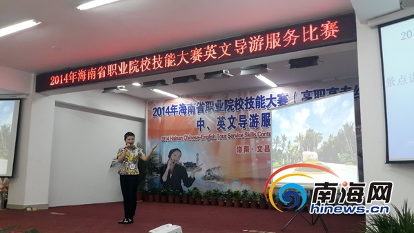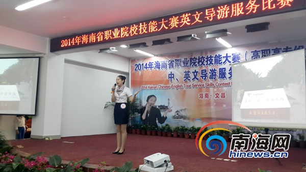4月22日上午,2014年海南省職業(yè)院校技能大賽“中英文導(dǎo)游服務(wù)”比賽在海南外國語職業(yè)學(xué)院舉行。39名選手在風(fēng)采展示、導(dǎo)游講解、知識(shí)問答等眾多環(huán)節(jié)中上演了一場精彩的中英文比拼好戲。 (南海網(wǎng)記者 陳麗娜攝)