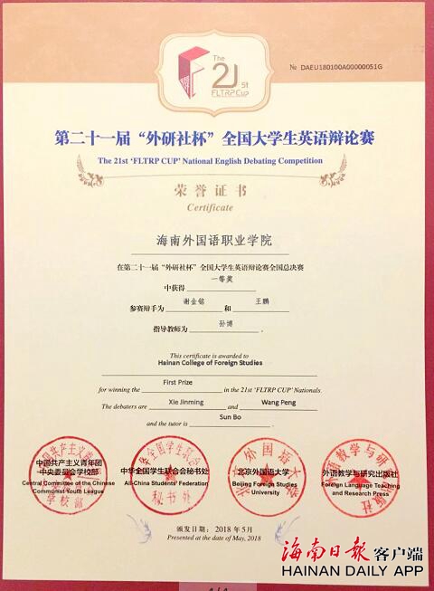 ??5月21日,由團中央、全國學(xué)聯(lián)秘書處、北京外國語大學(xué)主辦的第21屆“外研社杯”全國大學(xué)生英語辯論賽全國總決賽在北京落幕。海南外國語職業(yè)學(xué)院代表隊表現(xiàn)優(yōu)異,獲得了全國總決賽一等獎。這是我省高校也是全國高職院校在本賽事中獲得的歷史最好成績。