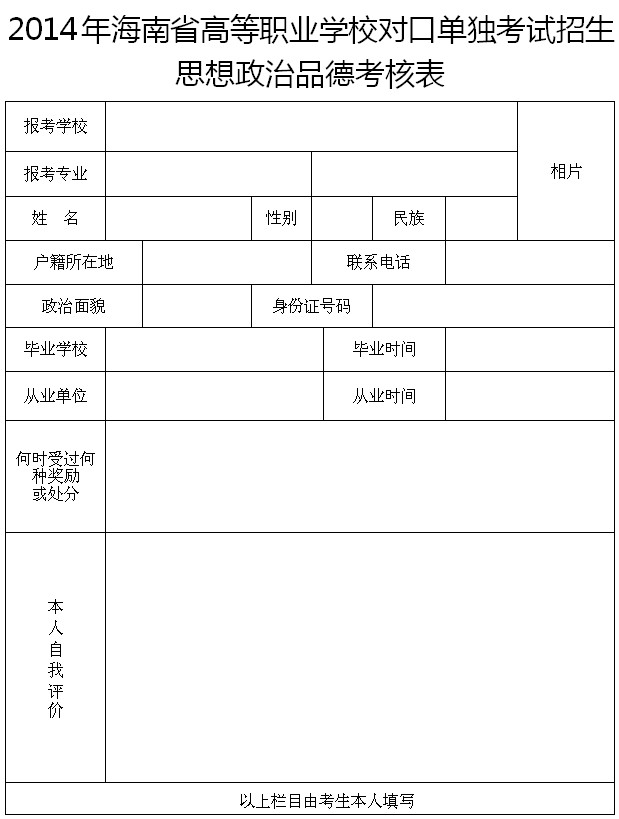2.2014年海南省高等職業(yè)學(xué)校對(duì)口單獨(dú)考試招生思想政治品德考核表