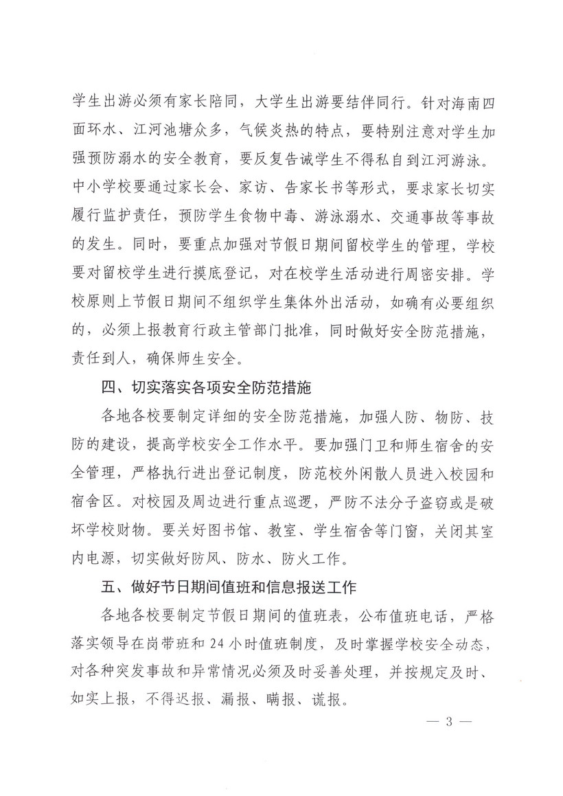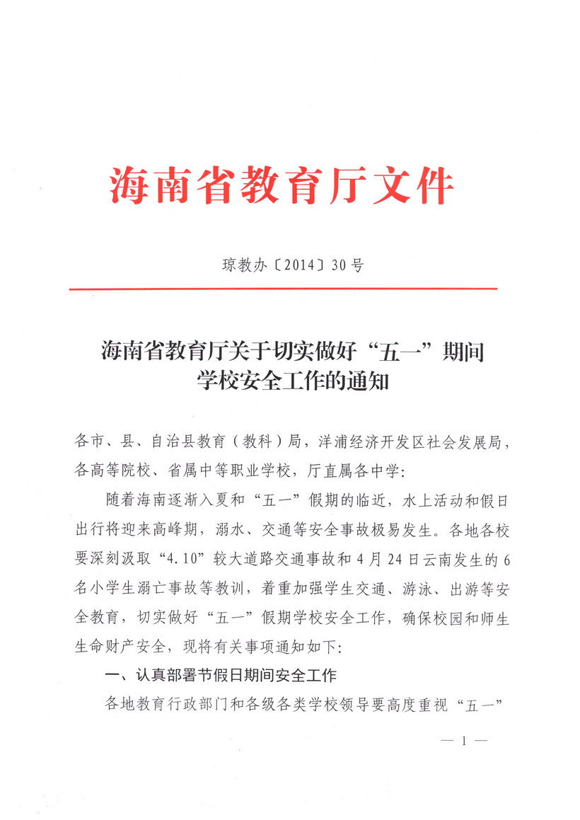 轉(zhuǎn):海南省教育廳關(guān)于切實做好“五一”期間學(xué)校安全工作的通知