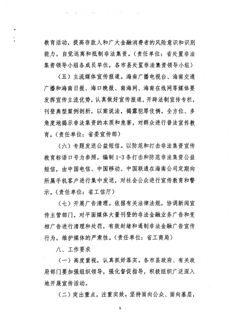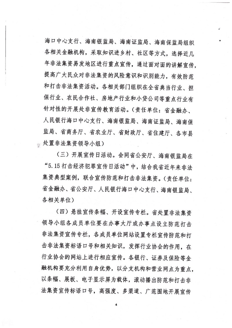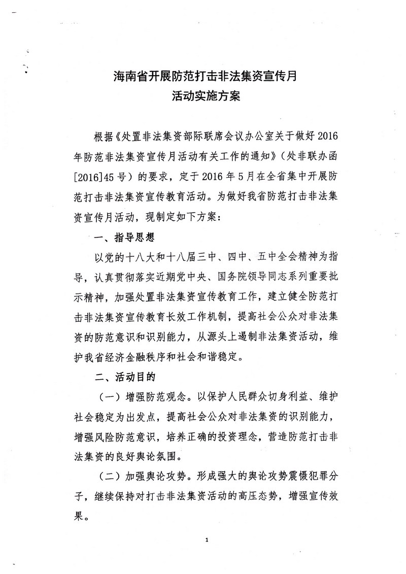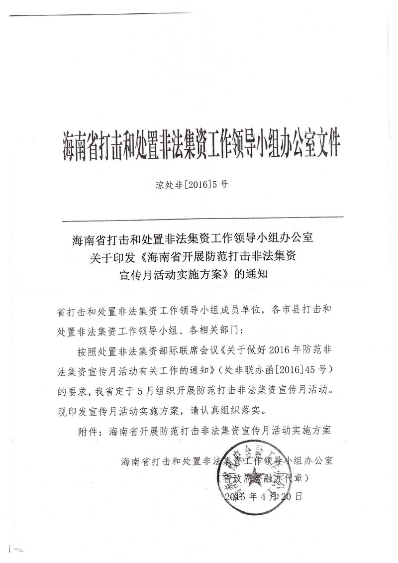 轉:海南省打擊和處置非法集資工作領導小組辦公室關于印發(fā)《海南省開展防范打擊非法集資宣傳月活動實施方案》的通知