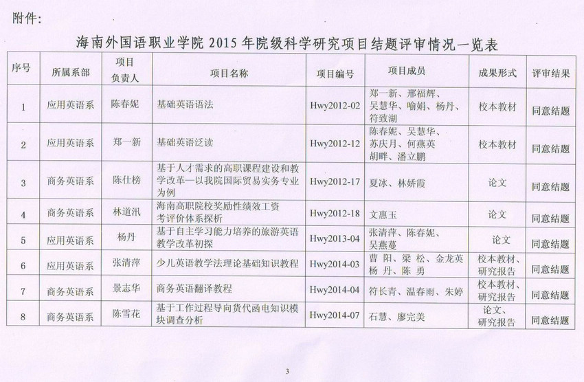 海南外國(guó)語(yǔ)職業(yè)學(xué)院關(guān)于公布2015年院級(jí)科學(xué)研究項(xiàng)目結(jié)題評(píng)審結(jié)果的通知