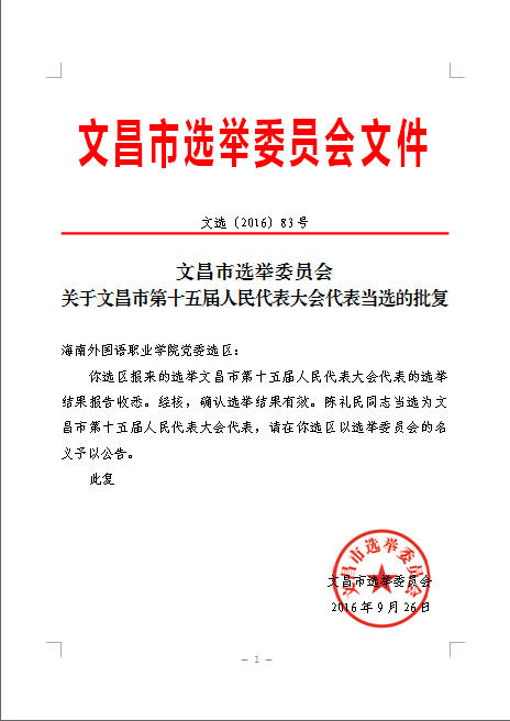 你選區(qū)報來的選舉文昌市第十五屆人民代表大會代表的選舉結果報告收悉。經(jīng)核,確認選舉結果有效。陳禮民同志當選為文昌市第十五屆人民代表大會代表,請在你選區(qū)以選舉委員會的名義予以公告。