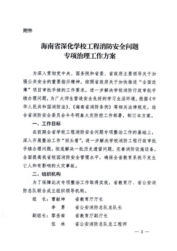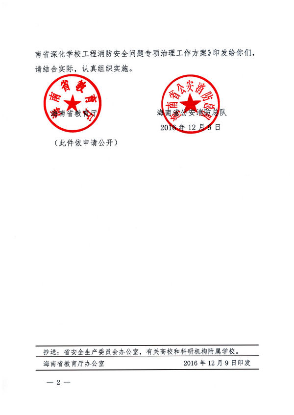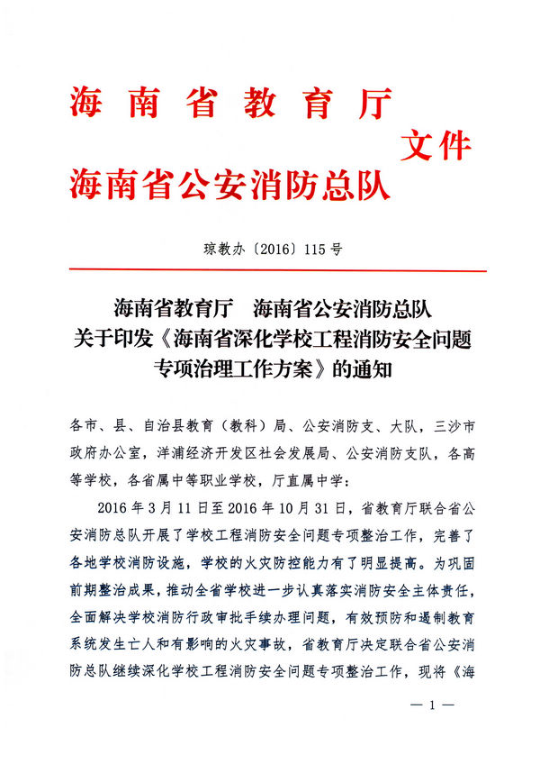 轉(zhuǎn):海南省教育廳 海南省公安消防總隊 關(guān)于印發(fā)《海南省深化學(xué)校工程消防安全問題專項治理工作方案》的通知