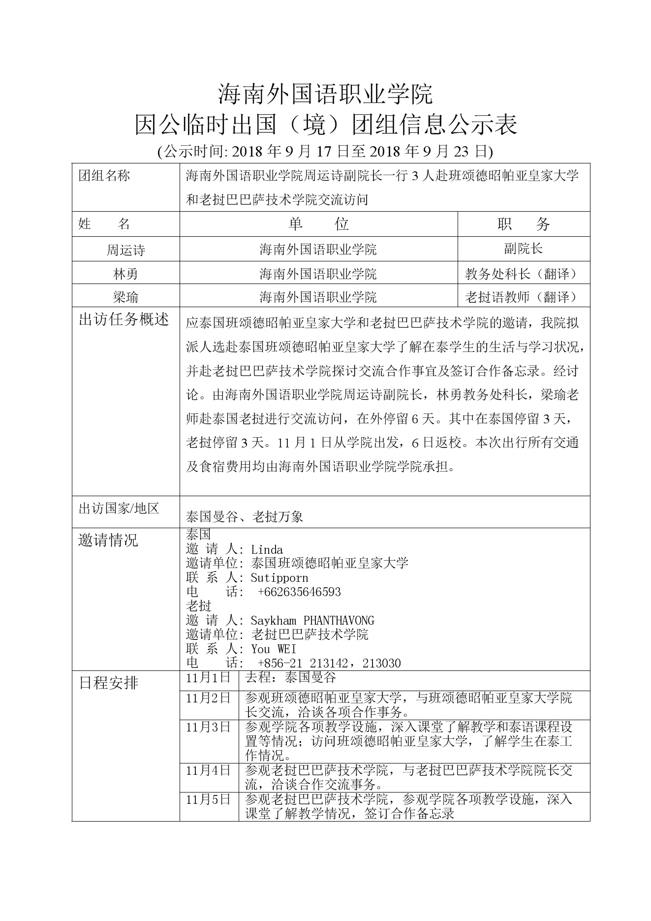 海南外國語職業(yè)學(xué)院 黨政干部因公出國(境)團(tuán)組信息公示表 (公示時間:2018年9月17日至2018年9月23日)