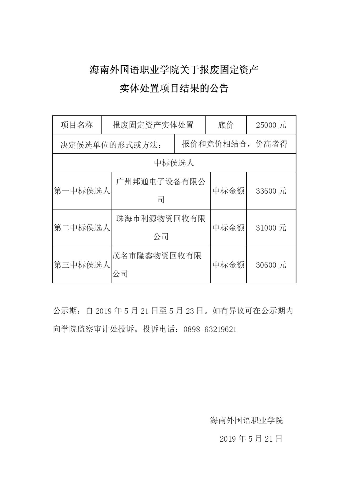 海南外國語職業(yè)學(xué)院關(guān)于報廢固定資產(chǎn)實體處置項目結(jié)果的公告