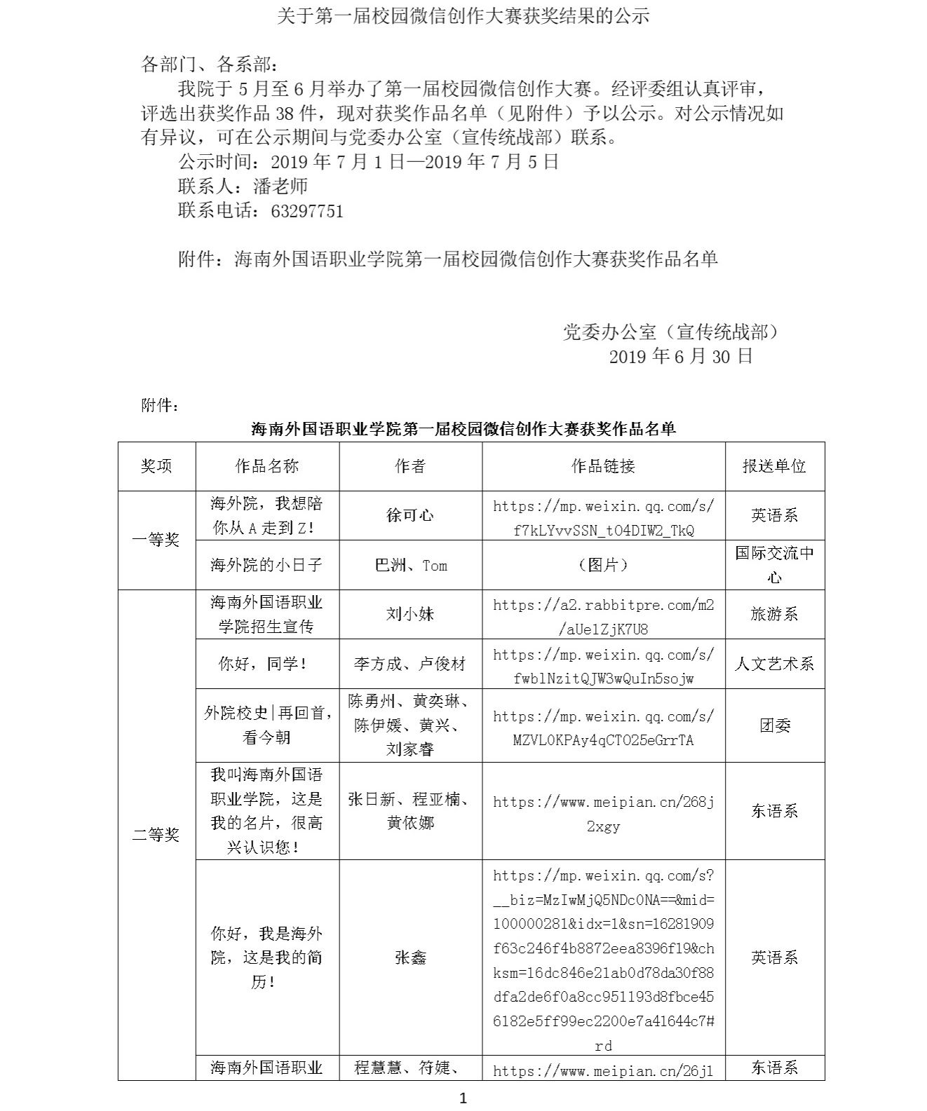 關(guān)于第一屆校園微信創(chuàng)作大賽獲獎結(jié)果的公示