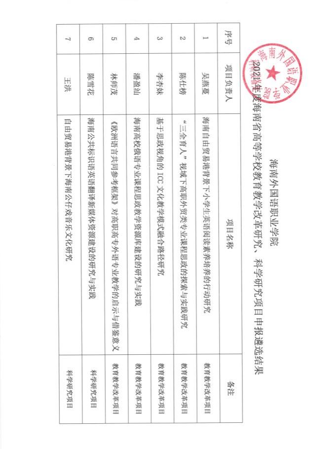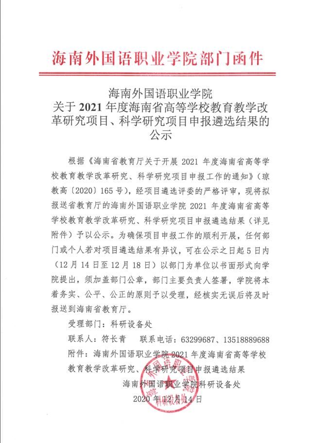 海南外國語職業(yè)學(xué)院關(guān)于2021年度海南省高等學(xué)校教育教學(xué)改革研究項目、科學(xué)研究項目申報遴選結(jié)果的公示