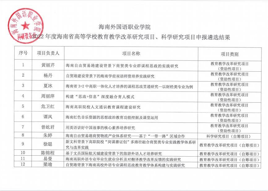 海南外國(guó)語職業(yè)學(xué)院關(guān)于2022年度海南省高等學(xué)校教育教學(xué)改革研究項(xiàng)目、科學(xué)研究項(xiàng)目申報(bào)遴選結(jié)果的公示