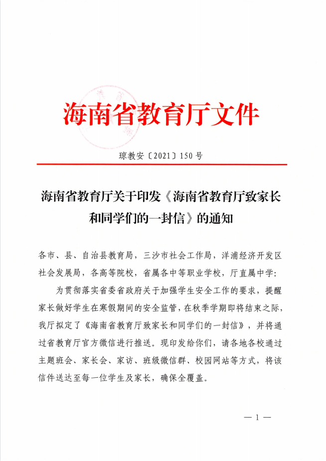 轉(zhuǎn):海南省教育廳關于印發(fā)《海南省教育廳致家長和同學們的一封信》的通知