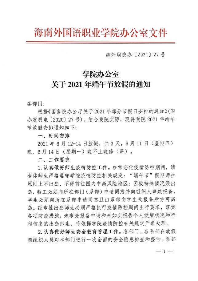 學(xué)院辦公室關(guān)于2021年端午節(jié)放假的通知