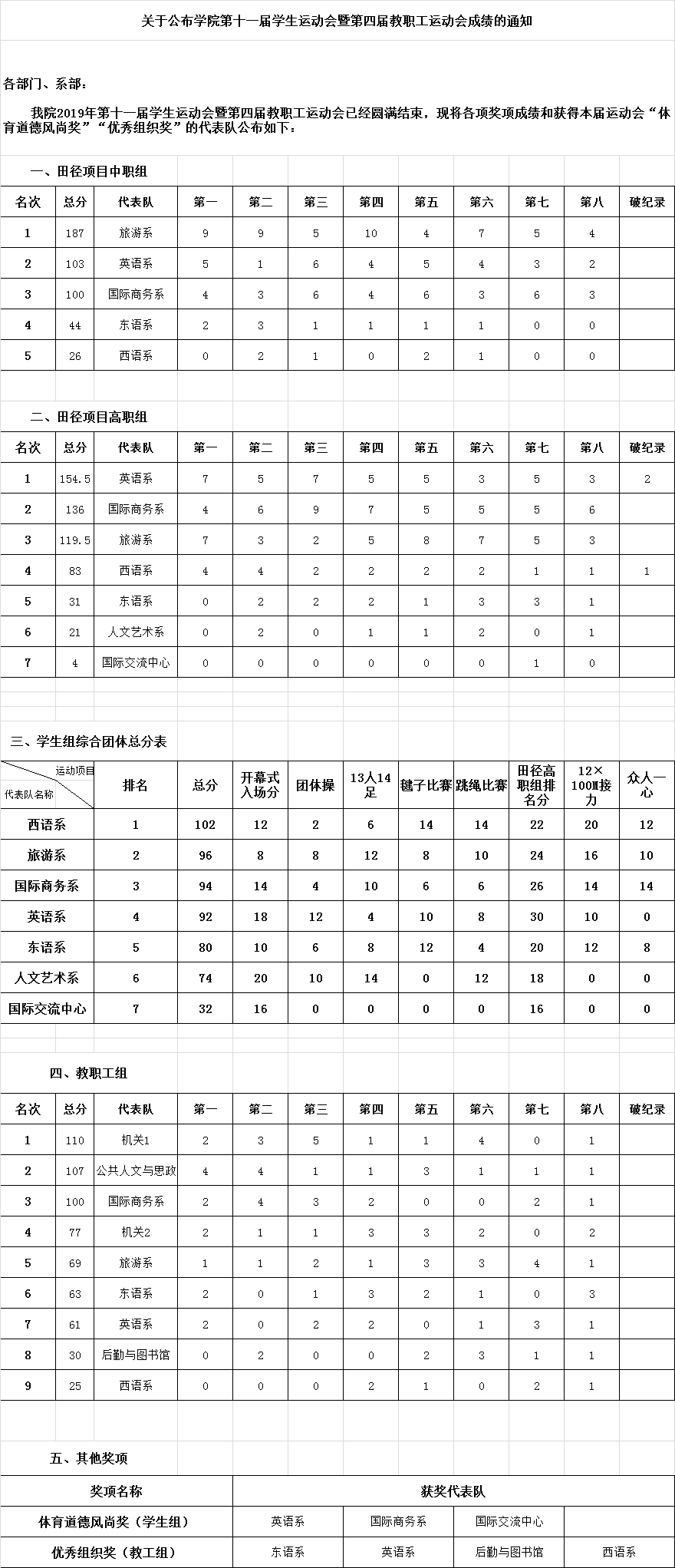 關(guān)于公布學(xué)院第十一屆學(xué)生運(yùn)動(dòng)會(huì)暨第四屆教職工運(yùn)動(dòng)會(huì)成績(jī)的通知