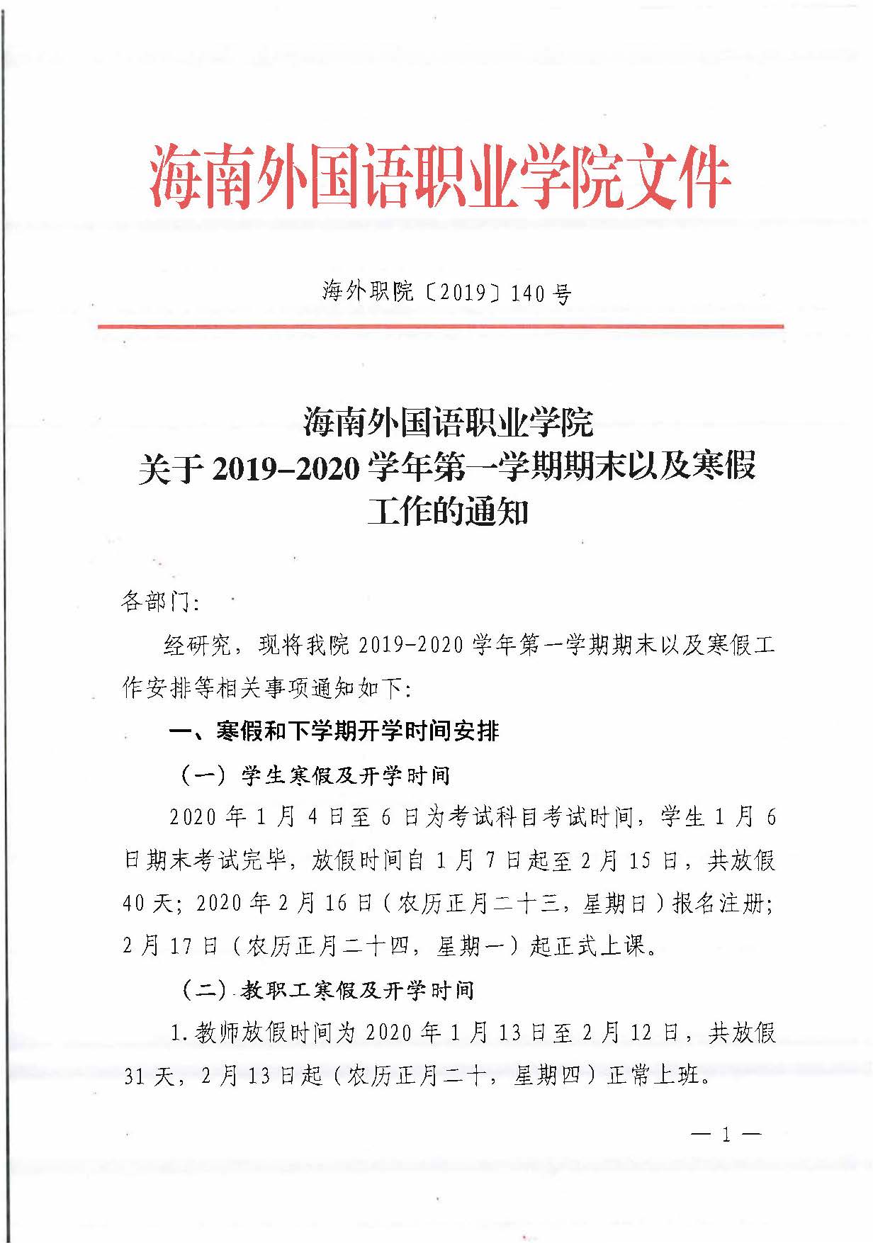 海南外國語職業(yè)學(xué)院關(guān)于2019-2020學(xué)年第一學(xué)期期末以及寒假工作的通知