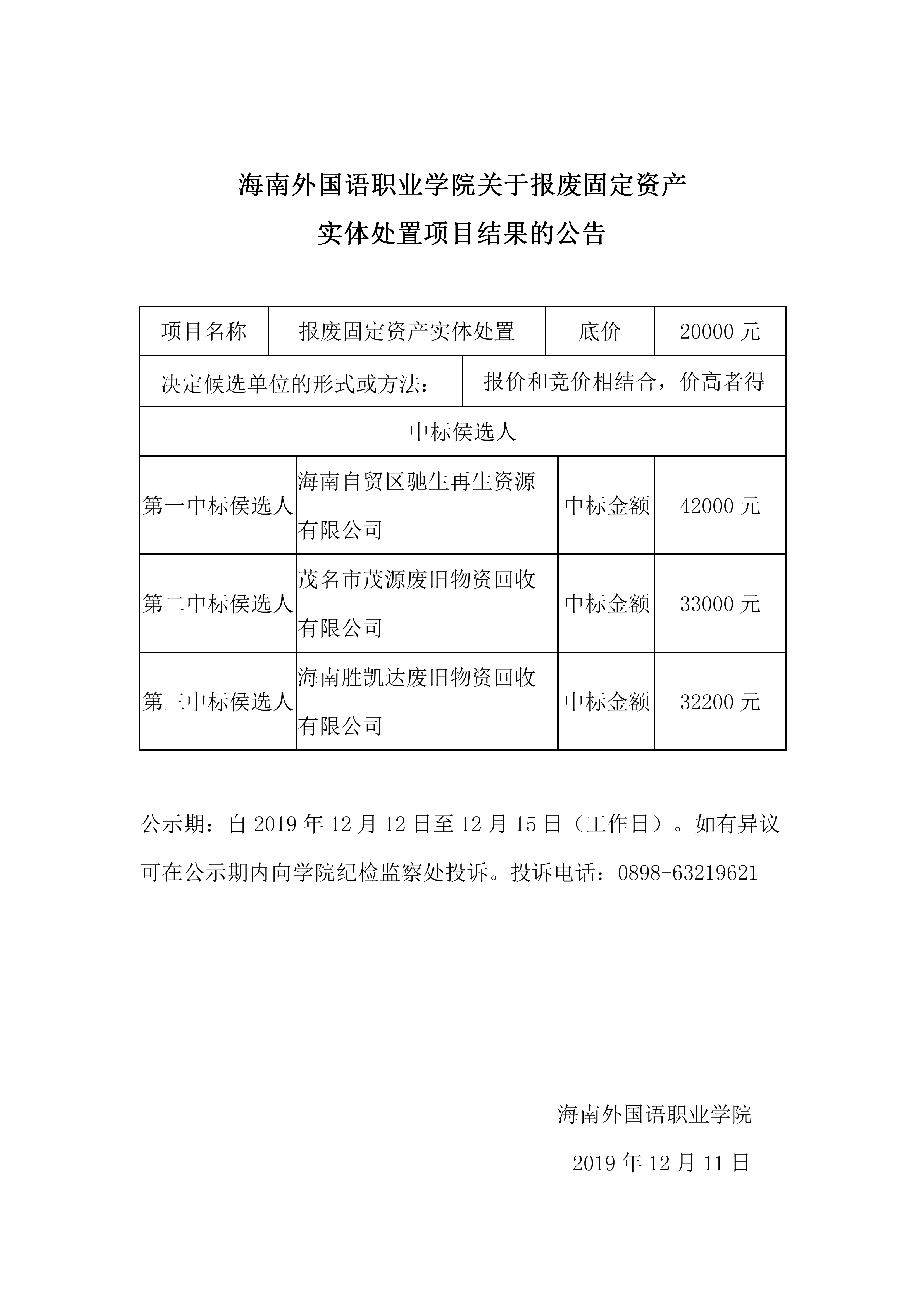 海南外國(guó)語(yǔ)職業(yè)學(xué)院關(guān)于報(bào)廢固定資產(chǎn)實(shí)體處置項(xiàng)目結(jié)果的公告