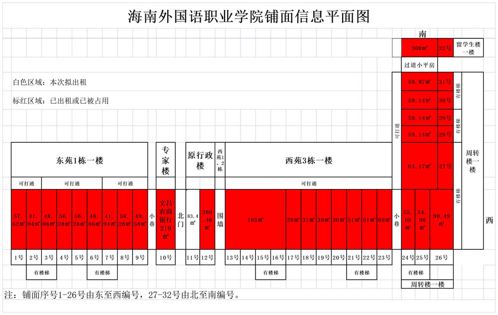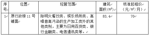 (三)此次招租鋪面的位置、經(jīng)營范圍、建筑面積、核準(zhǔn)起租價等詳見下表,如中租人測量的面積與本公告載明的建筑面積不相符,不改變租賃面積及金額,以本公告載明的建筑面積為準(zhǔn)。