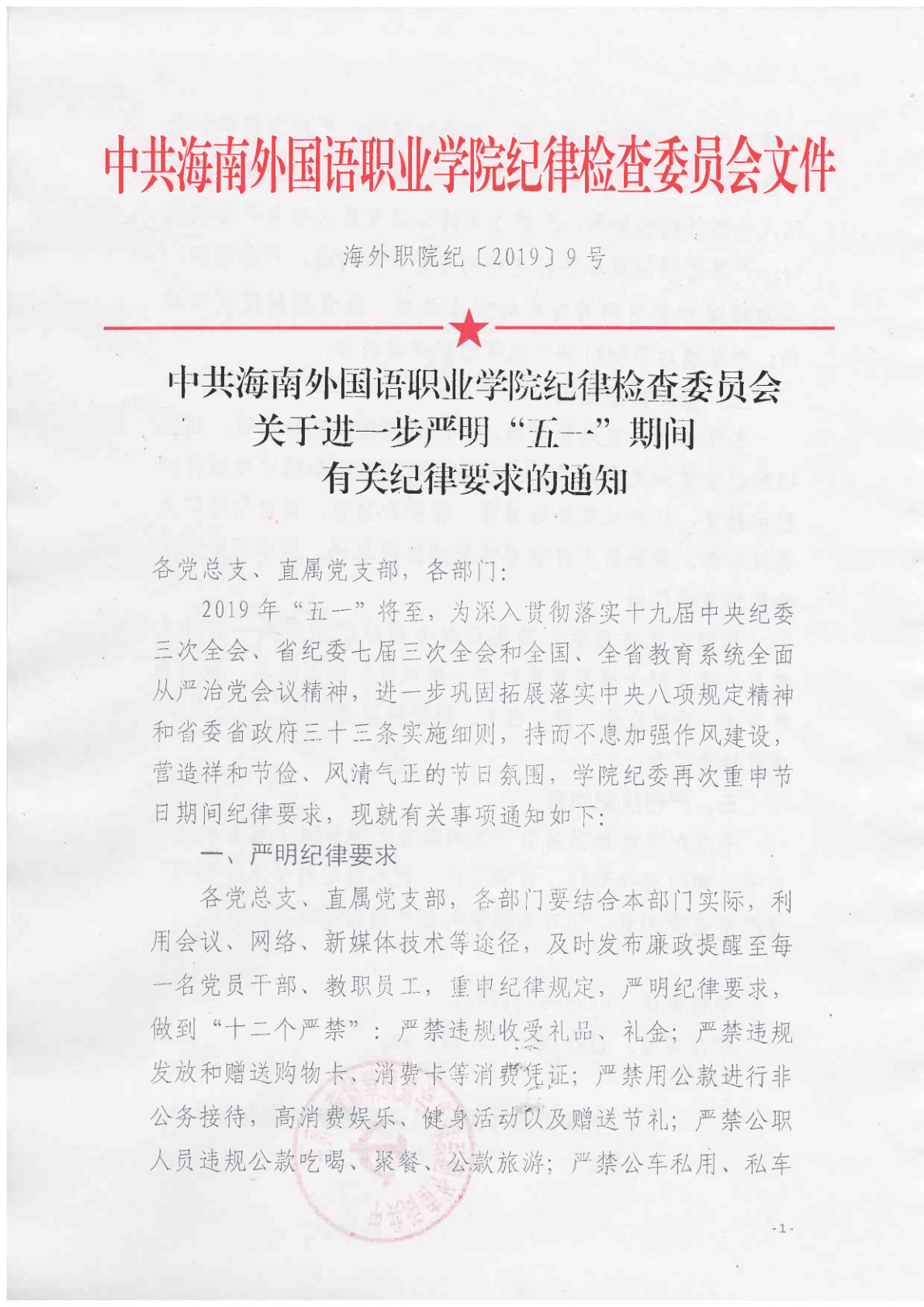 關(guān)于進(jìn)一步嚴(yán)明“五一”期間有關(guān)紀(jì)律要求的通知