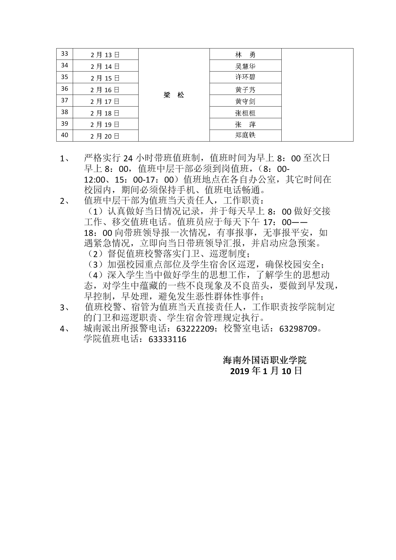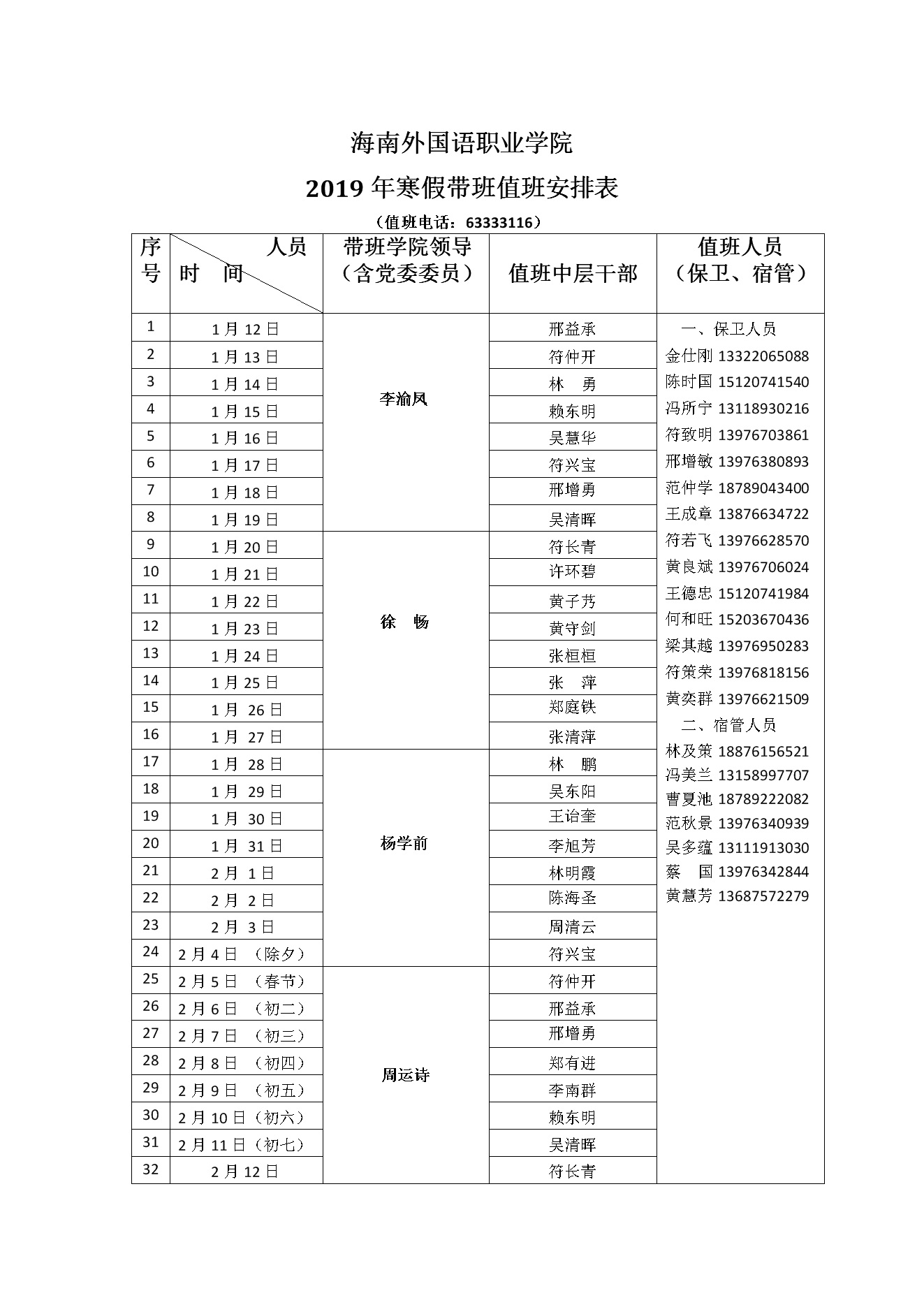 海南外國(guó)語職業(yè)學(xué)院2019年寒假帶班值班安排表