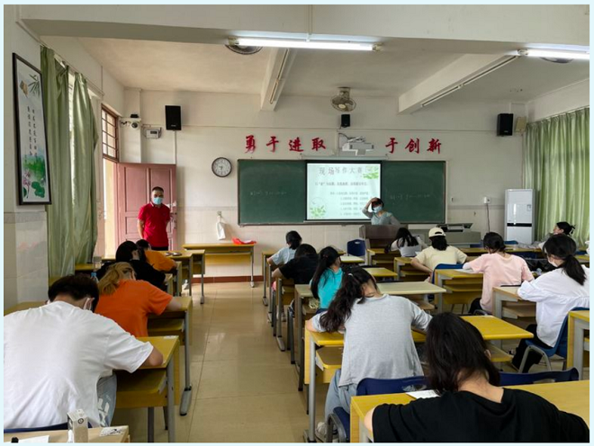 ??選手們積極配合監(jiān)考老師們認(rèn)真完成簽名、整理座位和按要求作文等各項(xiàng)工作。比賽伊始,教室里的氣氛立時(shí)緊張起來(lái)。訓(xùn)練有素的同學(xué)們沉著應(yīng)對(duì),他們審題仔細(xì),構(gòu)思認(rèn)真。有的先擬寫(xiě)了大綱,再根據(jù)大綱專(zhuān)心寫(xiě)作。一切都在有序地進(jìn)行著。一個(gè)半小時(shí)后,大家均已順利完成并上交了作品。