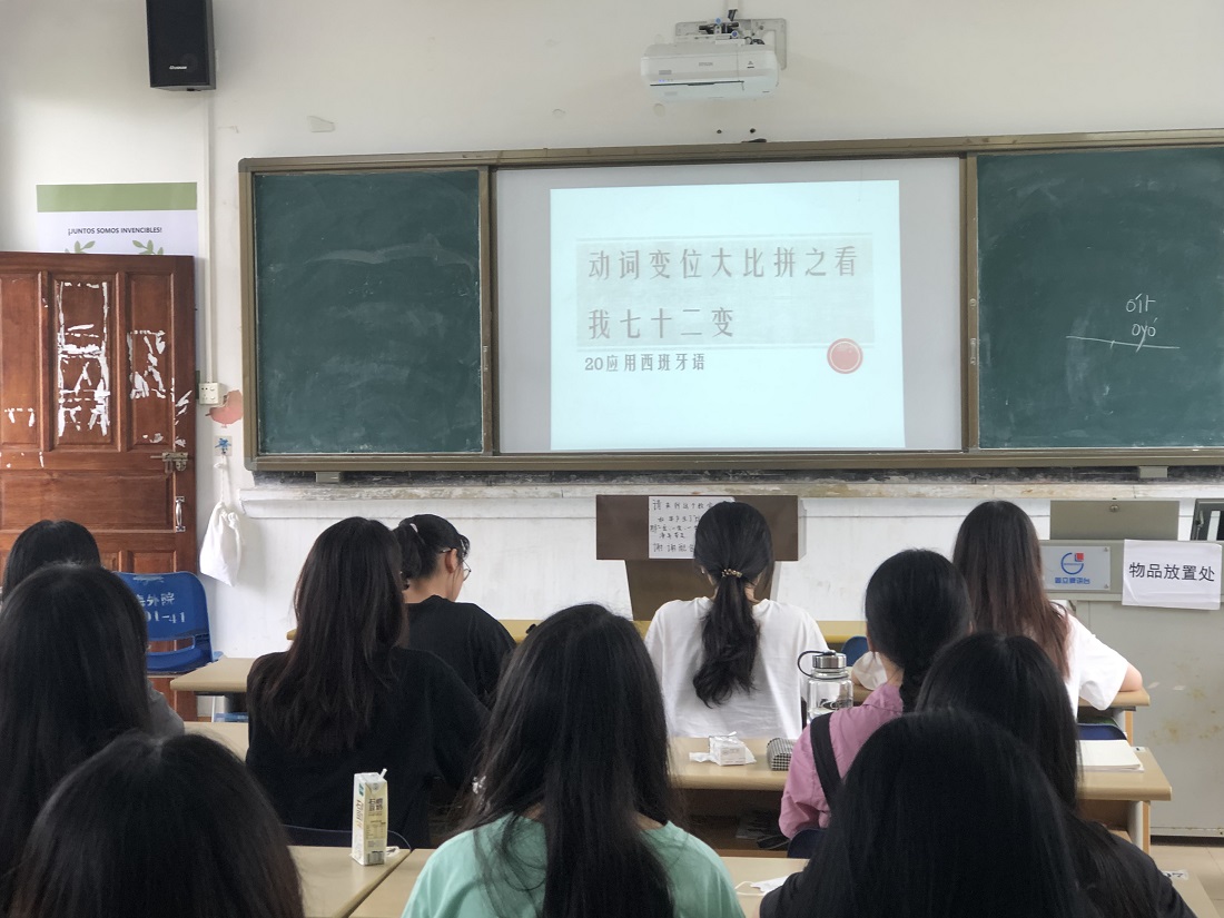 為活躍學(xué)生學(xué)習(xí)氛圍,提高學(xué)生的學(xué)習(xí)積極性并考察學(xué)生學(xué)習(xí)情況,5月9日20應(yīng)西班在1404舉行了語言技能訓(xùn)練之動(dòng)詞變位大比拼。比拼前,教師先對動(dòng)詞進(jìn)行總結(jié),從動(dòng)詞的功用、分類以及復(fù)雜的語法變化,包括人稱、時(shí)態(tài)和語態(tài)等方面概述。隨后進(jìn)行動(dòng)詞變位大比拼,比拼分為兩輪,第一輪為搶答,教師展示變位動(dòng)詞,學(xué)生搶答動(dòng)詞原形;第二輪為計(jì)時(shí)答題,要求學(xué)生在規(guī)定的時(shí)間內(nèi)完成50道動(dòng)詞變位題,結(jié)束答題后教師進(jìn)行講解。
