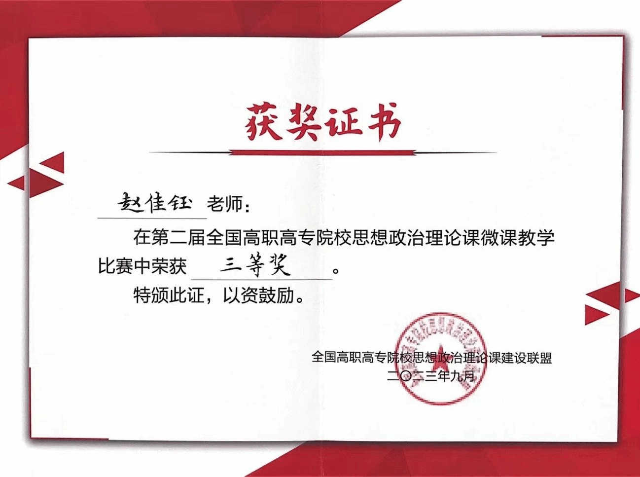 在今年7月至9月舉行的第二屆全國高職高專院校思想政治理論課微課教學(xué)比賽中,我校馬克思主義學(xué)院趙佳鈺老師榮獲三等獎。
