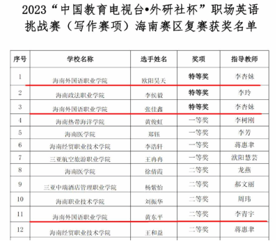 11月5日,2023年“中國教育電視臺·外研社杯”職場英語挑戰(zhàn)賽(寫作賽項(xiàng))海南賽區(qū)復(fù)賽落下帷幕,來自全省13所高職院校的34名選手參賽。由李杏妹老師指導(dǎo)的我校英語學(xué)院歐陽昊天和張佳鑫兩位同學(xué)表現(xiàn)優(yōu)異、脫穎而出,分別斬獲比賽特等獎(jiǎng),將代表海南省參加今年12月在北京舉辦的全國總決賽。由李青宇老師指導(dǎo)的國際商務(wù)學(xué)院黃東平同學(xué)獲得比賽二等獎(jiǎng)。