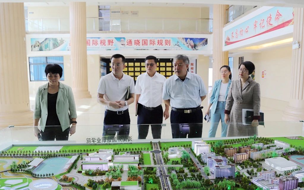 在學(xué)校規(guī)劃沙盤前,省政協(xié)調(diào)研組一行聽取了我校辦學(xué)情況介紹,對我校76年來形成的辦學(xué)特色、文化精神積淀,特別是近年來所取得辦學(xué)成績給予充分肯定和贊許。在了解了我校產(chǎn)教融合和對外合作情況后,調(diào)研組一行對學(xué)校進(jìn)一步加強(qiáng)開放辦學(xué)提出寶貴意見建議。