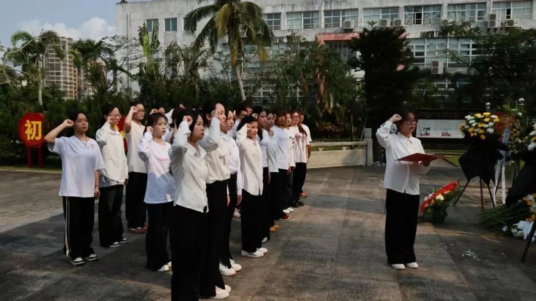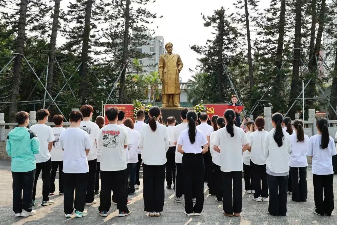 在莊嚴(yán)肅穆的張?jiān)埔輰④娿~像前,舉行了緬懷儀式。同學(xué)們敬獻(xiàn)花圈,整裝肅立、垂首默哀,并手持白菊繞行銅像寄托哀思。在重溫入團(tuán)誓詞環(huán)節(jié),大家在領(lǐng)誓人的帶領(lǐng)下,舉起右手,莊嚴(yán)宣誓,鏗鏘誓言在紀(jì)念館廣場久久回蕩。