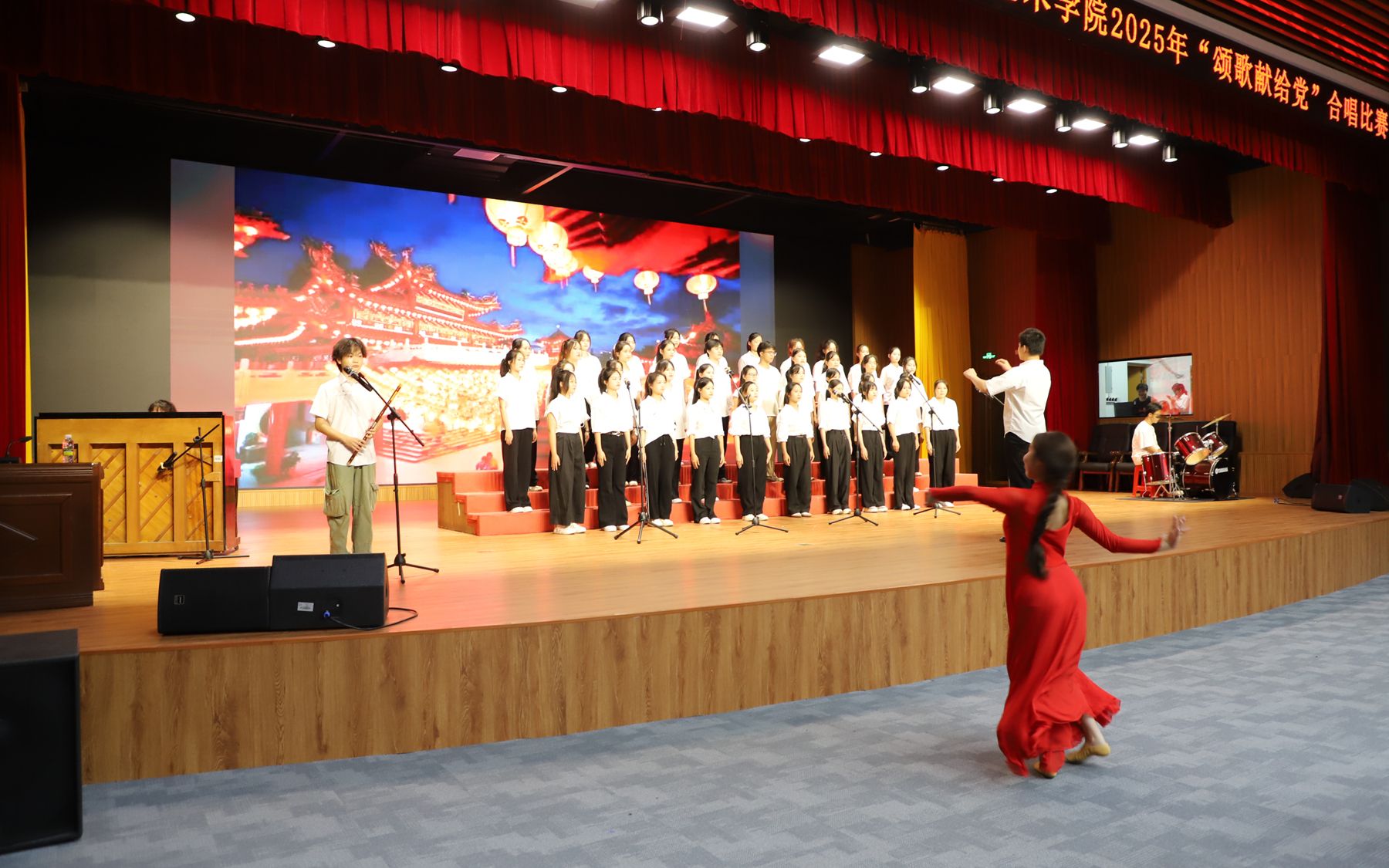 比賽在莊嚴(yán)熱烈的氛圍中拉開帷幕。比賽現(xiàn)場(chǎng)氣氛熱烈,高潮迭起。各參賽隊(duì)伍身著統(tǒng)一服裝,隊(duì)列整齊,精神飽滿。在班級(jí)同學(xué)擔(dān)任的指揮帶領(lǐng)下,隊(duì)員們以嘹亮的歌聲和真摯的情感演繹了精心準(zhǔn)備的曲目,26支合唱隊(duì)伍精神抖擻,以《歌唱祖國(guó)》《燈火里的中國(guó)》《沒有共產(chǎn)黨就沒有新中國(guó)》等經(jīng)典曲目唱響時(shí)代強(qiáng)音。從《七子之歌》的深情呼喚到《強(qiáng)軍戰(zhàn)歌》的鏗鏘豪邁,從《美麗中國(guó)》的錦繡畫卷到《這世界那么多人》的溫暖共鳴,學(xué)子們以多元藝術(shù)形式深情回顧黨的光輝歷程,熱情謳歌黨的豐功偉績(jī),詮釋新時(shí)代青年的使命擔(dān)當(dāng)。