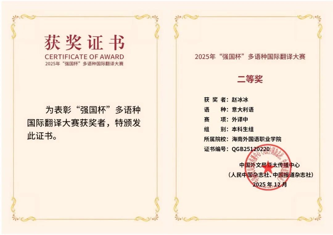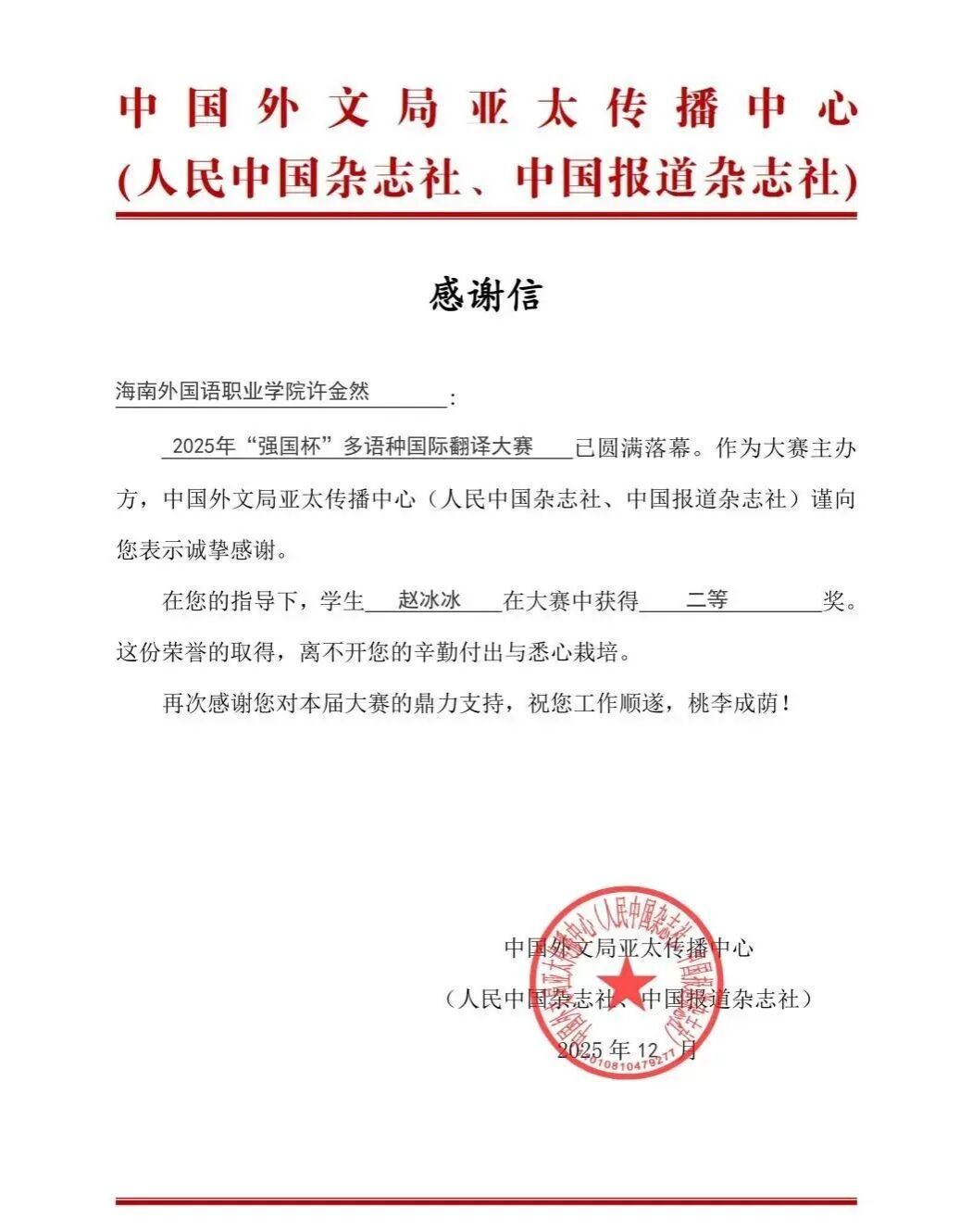 近日,中國(guó)外文局亞太傳播中心(人民中國(guó)雜志社、中國(guó)報(bào)道雜志社)主辦、廣東省翻譯協(xié)會(huì)協(xié)辦的2025年“強(qiáng)國(guó)杯”多語(yǔ)種國(guó)際翻譯大賽圓滿落幕。經(jīng)過(guò)激烈角逐,我校西方語(yǔ)言學(xué)院應(yīng)用意大利語(yǔ)專業(yè)學(xué)生趙冰冰榮獲意大利語(yǔ)外譯中本科生組二等獎(jiǎng),指導(dǎo)教師許金然收到主辦方發(fā)來(lái)的感謝信。