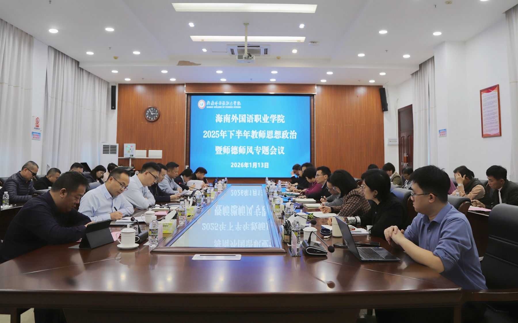 會上,校黨委副書記、校長黃學彬帶領(lǐng)學習習近平總書記關(guān)于師德師風建設(shè)的重要論述以及教育部關(guān)于完善高校教師思想政治和師德師風建設(shè)工作體制機制的指導意見;校黨委副書記雷浩澤匯報學校2025年學校教師思想政治和師德師風建設(shè)情況,部署2026年重點工作。