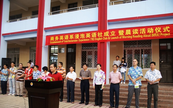 據(jù)了解,商務英語系“浸泡英語”社成立后將隨即開展兩個活動項目,一是每周一至周五進行的晨讀活動。與學生自發(fā)的晨讀不同,“浸泡英語”社的晨讀將采用由商務英語系老師編寫的晨讀教材,主要朗讀學習脫口名言、英語四六級寫作范文及詞匯等內(nèi)容,活動以班級為單位,由負責老師和社團負責人主持與監(jiān)督,確保了晨讀效果;二是每周六進行的周末活動,進行包括晨讀效果檢驗、各類考試知識學習、英語趣味性知識學習、西方文化體驗、商務知識知識學習、時事知識學習等內(nèi)容。