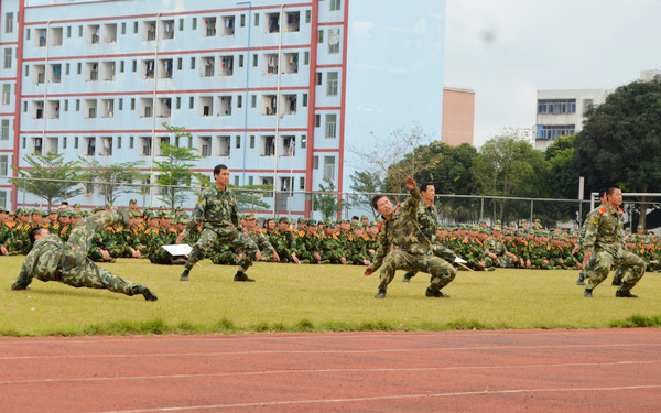 當(dāng)天下午4時(shí),伴隨著雄壯的軍樂曲,在教官的帶領(lǐng)下,8個(gè)方陣的同學(xué)們,以嚴(yán)整的軍容、整齊的步伐,通過主席臺(tái)接受學(xué)校領(lǐng)導(dǎo)、教官和老師們的檢閱。檢閱結(jié)束后,文昌市公安邊防支隊(duì)機(jī)動(dòng)中隊(duì)的教官們?yōu)楝F(xiàn)場(chǎng)師生表演了一套精彩的軍體拳。