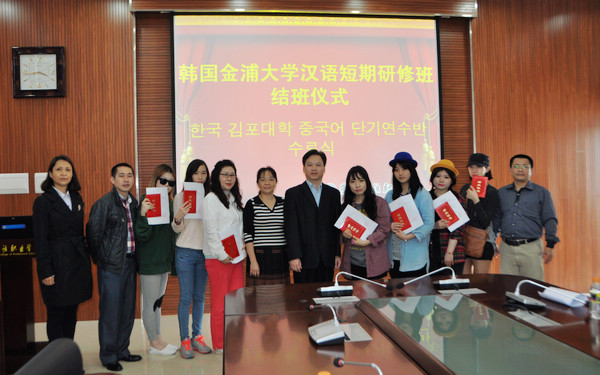 隨著寒假的來臨,來自韓國金浦大學(xué)的7名學(xué)生結(jié)束了他們在我院為期25天的漢語學(xué)習(xí),即將踏上返國歸途。1月10日下午,我院在綜合樓7樓第一會(huì)議室舉行結(jié)班儀式,楊學(xué)前副院長,教務(wù)處、對外合作交流處、東語系有關(guān)部門負(fù)責(zé)人與我院韓語專業(yè)學(xué)生代表參加儀式,為韓國留學(xué)生送行。