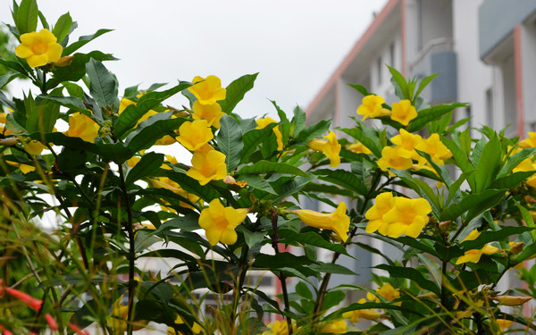 另一頭,陽光下,在一片郁郁蔥蔥、蓬勃盎然的綠葉叢中,黃嬋也盡情綻放著。那嬌滴的黃,完美地呈現(xiàn)了花瓣的柔,就如黛玉般經不起風雨,使過往的行人愛憐不已,不禁想把她捧在手心里。那黃嬋宛若絕世的仙女,雖然柔弱,但傾國傾城。