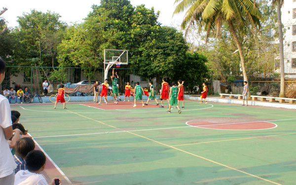 籃球場上,男生女生們在打著籃球,一群人,雖然是在爭搶一個籃球。但是否能摸到、搶上籃球絲毫不影響他們之間的交往。他們打籃球只是對這項運動喜愛的體現(xiàn)。打完球,坐在籃球架下休息,不說話,靜靜感覺柔和的氣氛。