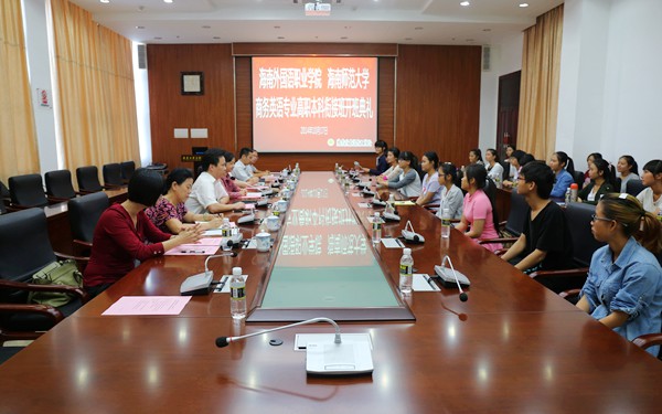 10月17日下午,我院與海南師范大學(xué)“商務(wù)英語(yǔ)專業(yè)高職本科銜接班”在我院綜合樓七樓第一會(huì)議室舉辦開(kāi)班儀式,海南師范大學(xué)外國(guó)語(yǔ)學(xué)院院長(zhǎng)楊蕾達(dá),我院院長(zhǎng)李渝鳳、副院長(zhǎng)楊學(xué)前,以及我院教務(wù)處、商務(wù)英語(yǔ)系負(fù)責(zé)人和我院“商務(wù)英語(yǔ)專業(yè)高職本科銜接班”的全體學(xué)生出席了開(kāi)班儀式。儀式由我院副院長(zhǎng)楊學(xué)前主持。
