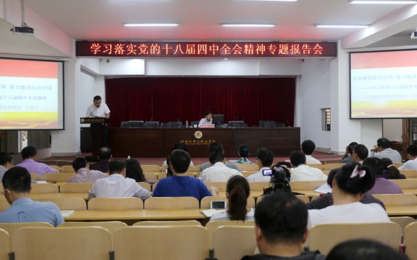 為深入學習宣傳貫徹黨的十八屆四中全會精神,切實把廣大師生的思想和行動統(tǒng)一到中央關(guān)于全面推進依法治國的重大決策部署上來,11月18日下午,我院在多功能報告廳舉辦學習黨的十八屆四中全會精神專題報告會,中共海南省委黨校副校長王和平教授應(yīng)邀為我院師生作專題報告,解讀黨的十八屆四中全會精神。