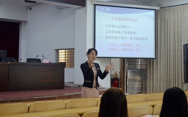 講座一開始,朱麗萍老師就以輕松幽默的問候調(diào)動起現(xiàn)場師生的熱情,帶領(lǐng)大家走進(jìn)禮儀的優(yōu)雅世界。講座中,朱麗萍老師從“允許別人以貌取人”、“讓有我的地方和諧舒適”、“教養(yǎng)體現(xiàn)于細(xì)節(jié),細(xì)節(jié)展現(xiàn)素質(zhì)”等三方面切入,與師生分享深厚的禮儀文化,講解日?;镜慕浑H禮儀,使大家了解了接人待物的溝通技巧。朱麗萍老師深入淺出的講解、詼諧幽默的語言、生動形象的事例,讓現(xiàn)場笑聲、掌聲不斷。