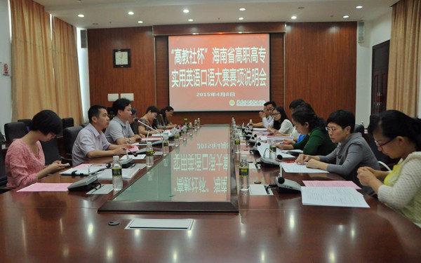 2015年全省職業(yè)院校技能大賽將于4月15日至22日舉行,我院將承辦大賽“實用英語口語”、“導游服務”和“國際貿(mào)易單證技能”等三項賽事的比賽。為協(xié)助辦好今年全省職業(yè)院校技能大賽,推進我院承辦的三項賽事的組織籌備工作,4月8日上午,我院分別在綜合樓7樓第一會議室、第二會議室及考試考務指揮中心組織召開了2015年海南省職業(yè)院校技能大賽海南外國語學院賽區(qū)說明工作會議,研究部署賽事相關工作。
