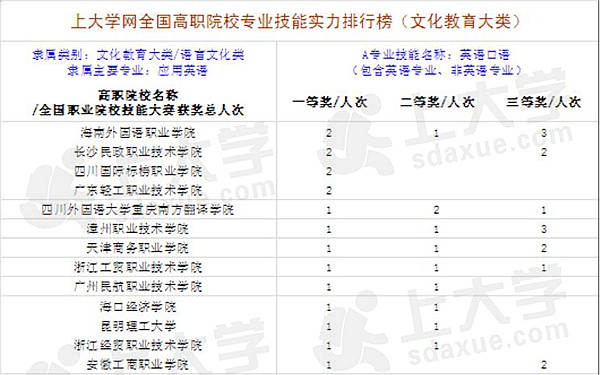 榜單顯示,海南外國(guó)語(yǔ)職業(yè)學(xué)院憑借2008年至2014年期間在全國(guó)各類大型職業(yè)技能比賽中斬獲一等獎(jiǎng)2人次,二等獎(jiǎng)1人次,三等獎(jiǎng)3人次的最優(yōu)成績(jī),從全國(guó)入選的111所高職院校中脫穎而出,雄居2015中國(guó)高職專業(yè)技能實(shí)力排行榜“英語(yǔ)口語(yǔ)”類榜單榜首。