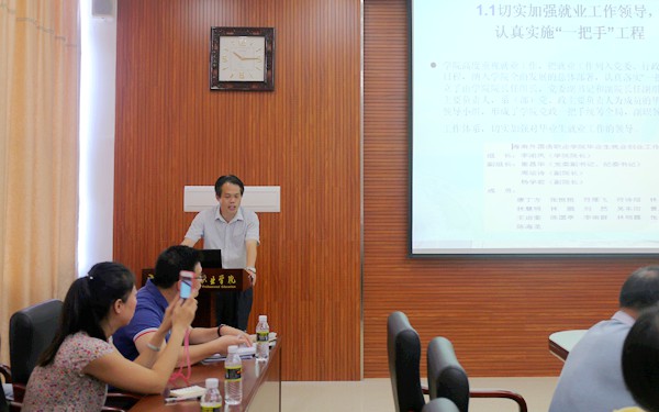 11月9日,海南省普通高校畢業(yè)生就業(yè)工作評(píng)估專(zhuān)家組蒞臨我院,對(duì)2014-2015年度我院就業(yè)工作進(jìn)行評(píng)估。學(xué)院黨委書(shū)記陳禮民、副院長(zhǎng)周運(yùn)詩(shī)出席會(huì)議,招生就業(yè)指導(dǎo)處等有關(guān)職能部門(mén)及各系部負(fù)責(zé)人參加了評(píng)估會(huì)。