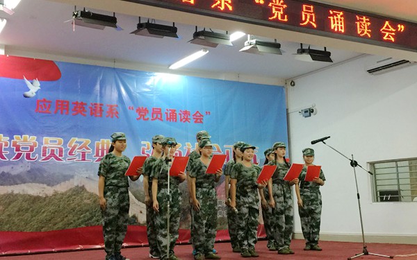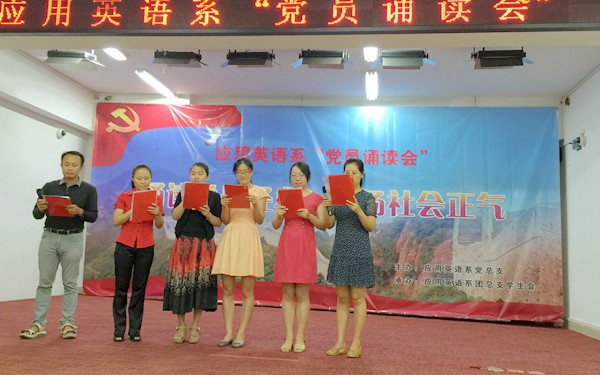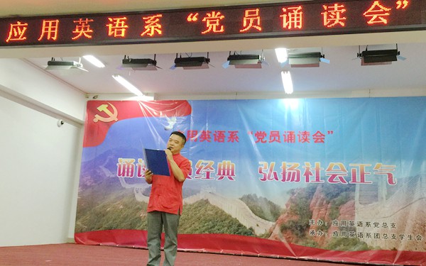 隨著一個個優(yōu)秀共產黨員的名字一次次被提起,一篇篇動人事跡被深情昂揚地歌頌,現場不時響起熱烈的掌聲。最后,由應用英語系黨總支主要負責人林鵬帶來的配樂詩朗誦《可愛的中國》把誦讀會氣氛推向高潮。
