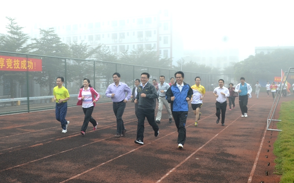開幕式最后,崔昌華副書記宣布第九屆學生田徑運動會暨2015年學生陽光體育冬季長跑活動正式開始。全體學院領導帶頭領跑,全院千余名師生一同加入了跑步的行列,邁出了陽光冬季長跑的步伐,把開幕式推向高潮,參與長跑的師生帶著飽滿的激情與活動,為冬日的校園增添了盎然生機。