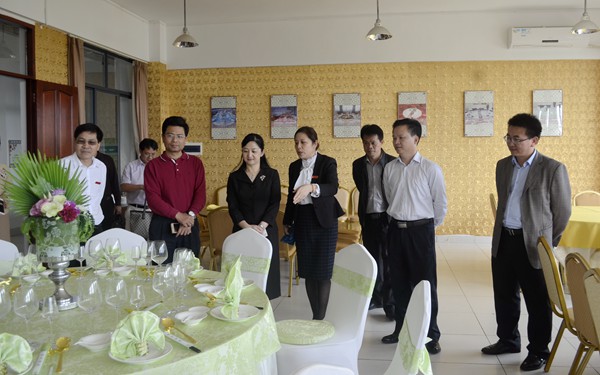 在海南省旅游學校馮樹祝校長、陳春福書記、邢益向副校長、張文魁副書記等的陪同下,李渝鳳院長一行首先參觀了省旅游學校的中餐實訓室、西餐實訓室、客房實訓室、烹飪實訓室、導游3D實訓室和高爾夫練習室等校內實訓場所。