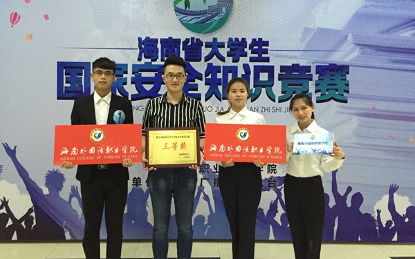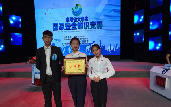 4月9日晚,由省教育廳主辦,省國家安全廳、海南職業(yè)技術(shù)學(xué)院協(xié)辦,海南廣播電視總臺承辦的海南省大學(xué)生國家安全知識競賽在海南廣播電視總臺舉行,來自全省各市縣的17支高校代表隊同臺競技。經(jīng)過激烈角逐,由我院學(xué)生王海君(商務(wù)英語系)、劉俐蔓(西語系)和黃志偉(旅游系)三名同學(xué)組成的我院代表隊在比賽中發(fā)揮出色,榮獲比賽三等獎,我院潘立鵬老師被評為“優(yōu)秀指導(dǎo)教師”。