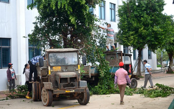 對校園內(nèi)的倒樹殘枝和散落垃圾進行清理
