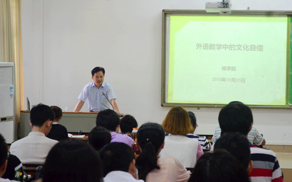楊學(xué)前副院長從“為什么要堅定文化自信”、“怎樣正確對待不同國家和民族的文明”、“外語教學(xué)中如何培養(yǎng)文化自信”三個方面深入闡述了堅定文化自信的重要性以及如何在外語教學(xué)中培養(yǎng)學(xué)生的民族文化自信,他認為,民族文化是一個國家、一個民族的立身之本,是大學(xué)教育的重要內(nèi)容,作為外語學(xué)院我們更應(yīng)該努力為踐行中國文化自信做出應(yīng)有的貢獻,我們要在教學(xué)中增強學(xué)生對優(yōu)秀傳統(tǒng)文化的認同,在外語教學(xué)中正確引導(dǎo)學(xué)生的文化價值觀,讓外語專業(yè)的學(xué)生在接受外來文化時樹立對中國優(yōu)秀傳統(tǒng)文化的自覺和文化自信,讓他們在橫向的文化開拓和縱向的文化傳承中分辨是非,把握方向,明確目標。