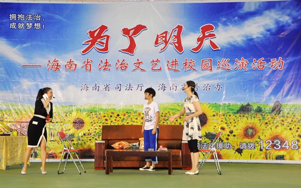 “為了明天——海南省法治文藝進校園”巡演活動,從2013年啟動以來,共巡演260多場。行程遍及全省除三沙市以外的25個市縣(區(qū)),共有40多萬名中學生和1萬多名學生家長、教師員工觀看了演出,受到了廣大師生和家長的熱烈歡迎,在社會上引起了廣泛的關注,并取得了良好的普法效果。