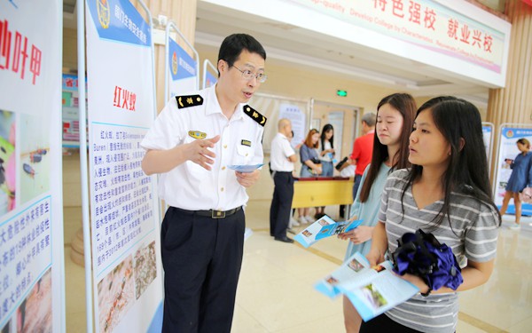 活動中,海南出入境檢驗檢疫局通過張貼紀念《中華人民共和國進出境動植物檢疫法》實施25周年海報、發(fā)放《國門生物安全倡議書》,展示截獲的有害生物標本方式,生動地向學生講述了國門生物安全的重要性,同時耐心回答學生對生態(tài)安全保護的相關問題。